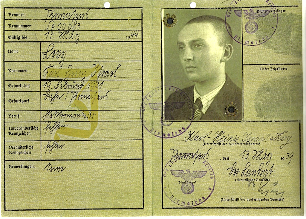 Karl-Heinz Israel Levy nach seiner Entlassung aus dem KZ Dachau, Kennkarte-1, PS, 13.März 1939
