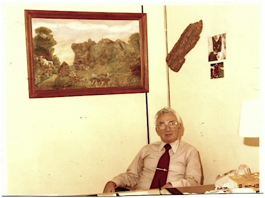 Karl-Heinz Levy der Künstler, mit Gemälde „Jungfernsprung“ 1980 & Skulptur „Braut & Bräutigam“ 1994 (von links nach rechts)