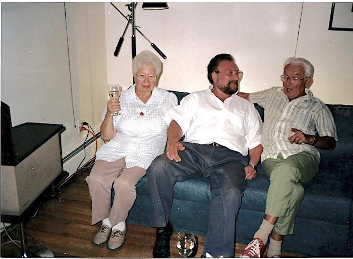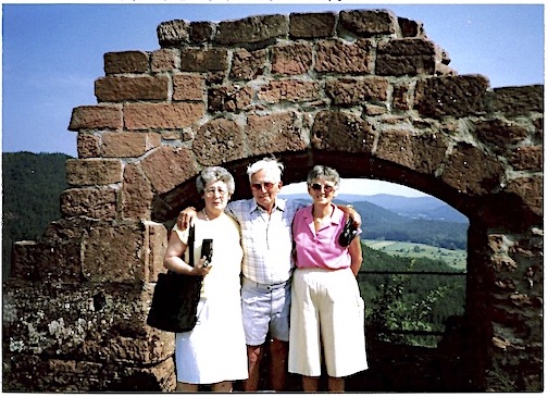 Karl-Heinz Levy mit Rosel & Gertrud auf Burg Altdahn, Heimattreffen im Juli 1991 – mit Hanna & Sohn Peter in New York 1993 (von links nach rechts)