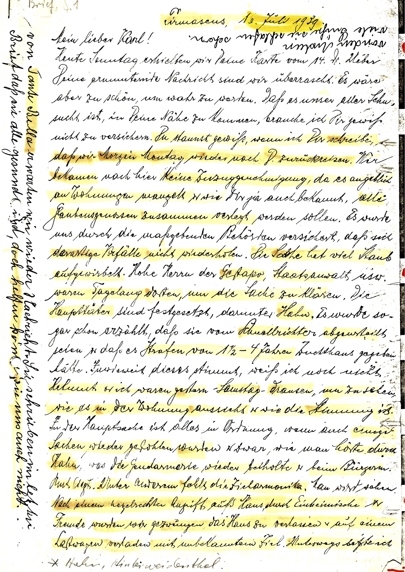 2. Brief, Seite 1, Pirmasens, 16.07.1939, Julius Levy an Sohn Karl-Heinz in London