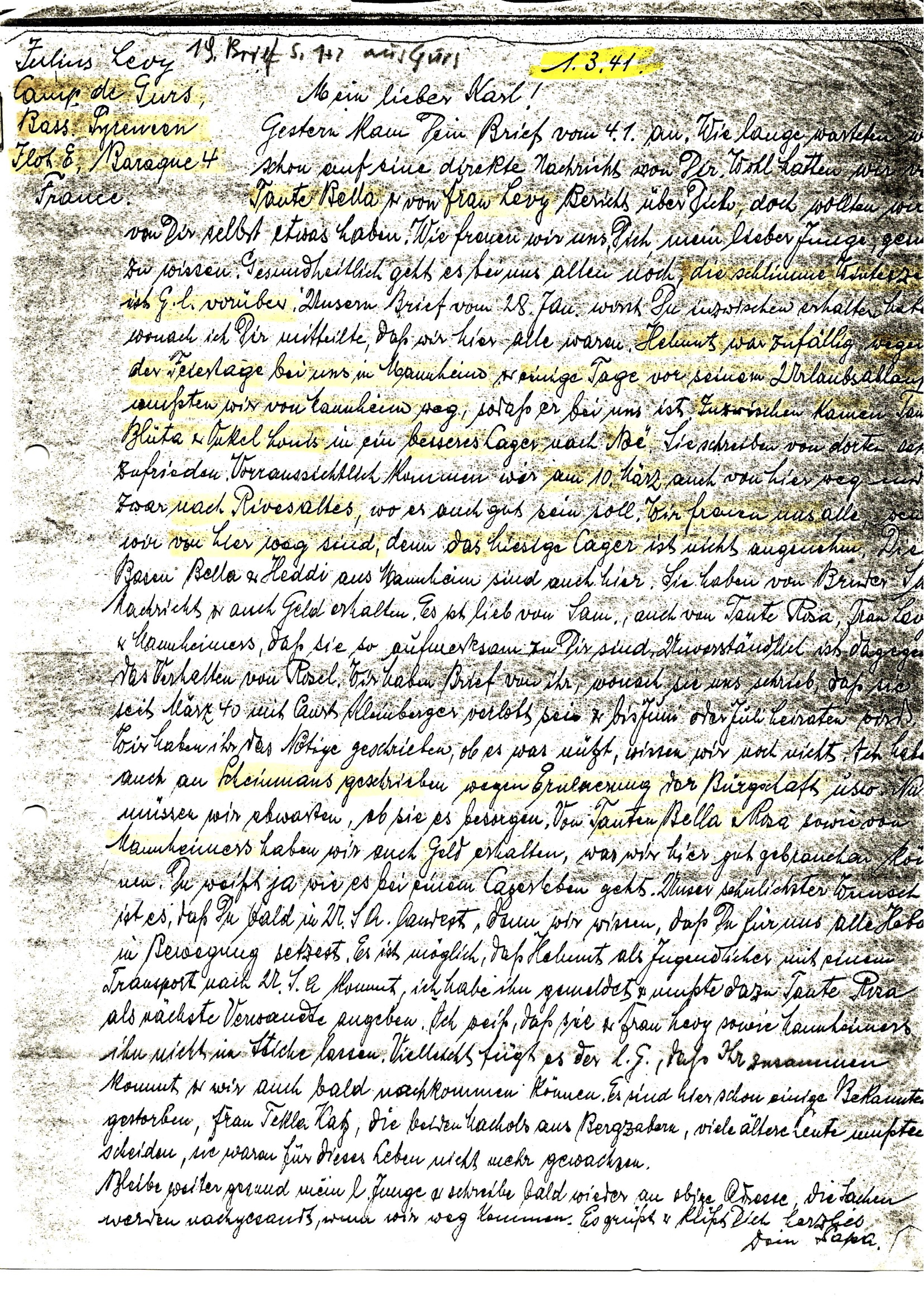 4. Brief, Seite 1, Camp Gurs, 01.03.1941, Julius Levy an Sohn Karl-Heinz in London