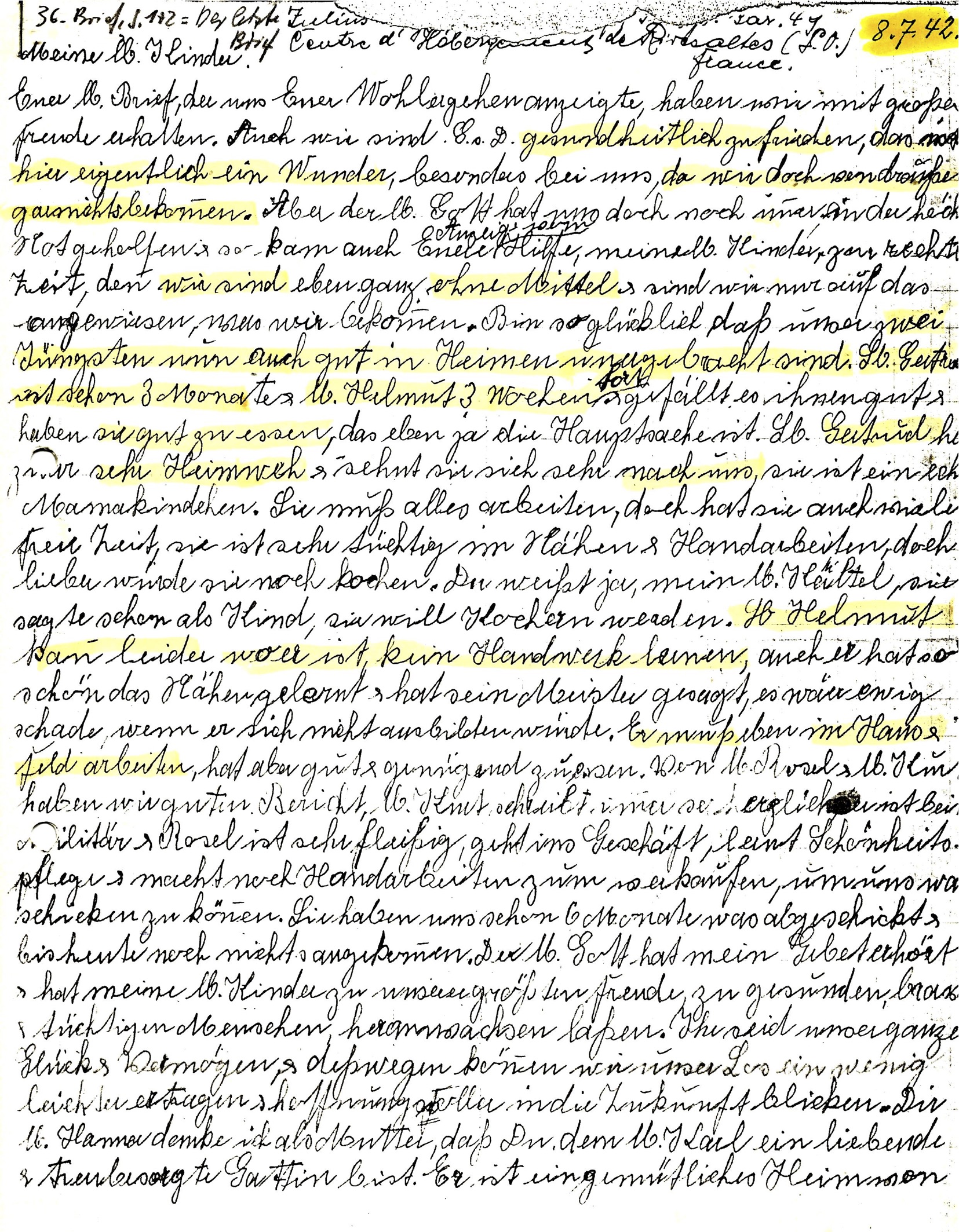 6. Brief, Seite 1/2, Camp Rivesaltes, 08.07.1942, Frau Levy an ihre Kinder. Der Letzte Brief. Am 26.08.1942 wurden Julius und Elsa Levy mit dem Transport Nr. 24 nach Auschwitz deportiert, wo sie umgekommen sind.