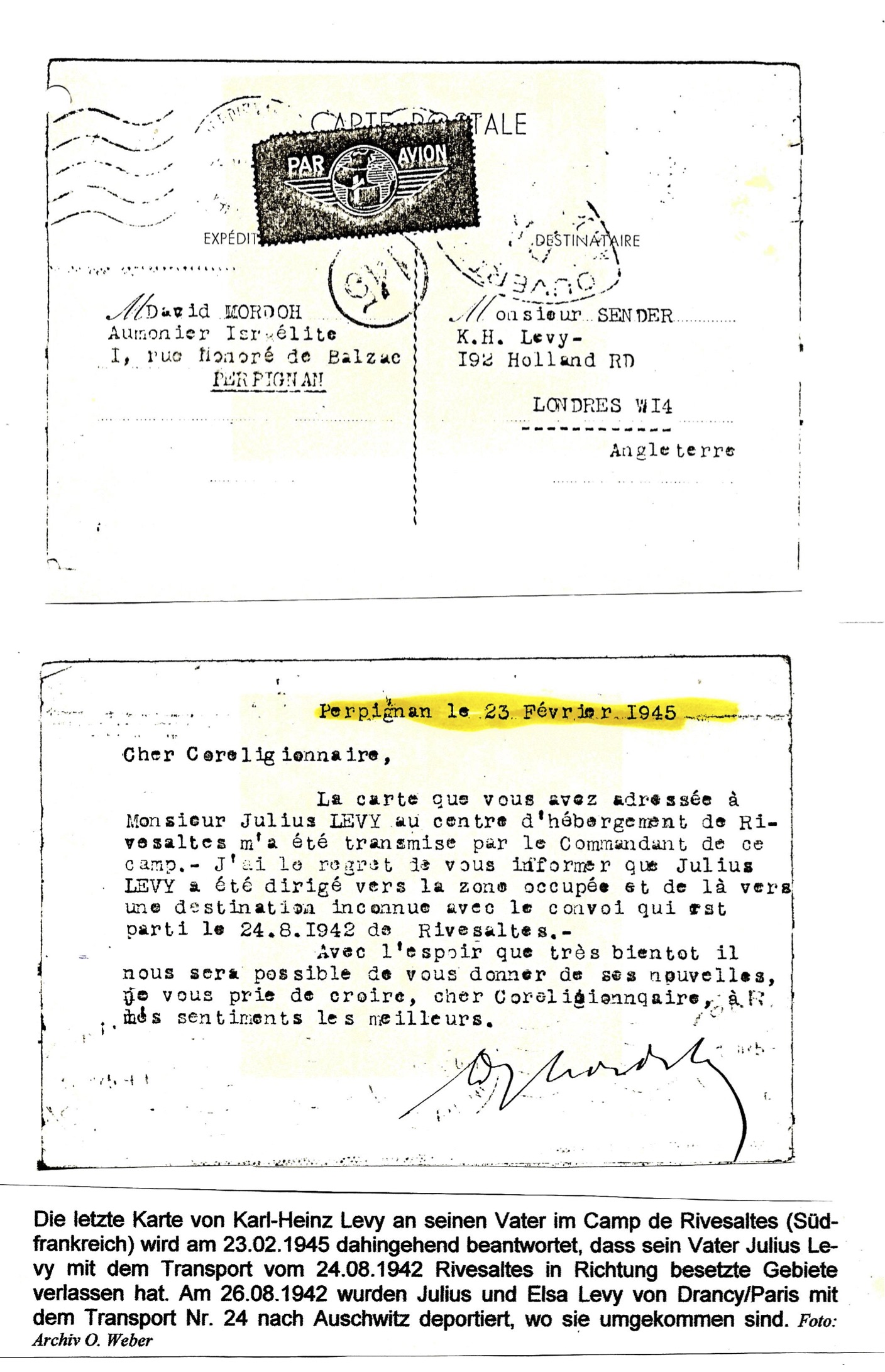 7. Brief, Seite 1, Perpignan, 23.02.1945, Postkarte, Antwort an Karl-Heinz Levy in London