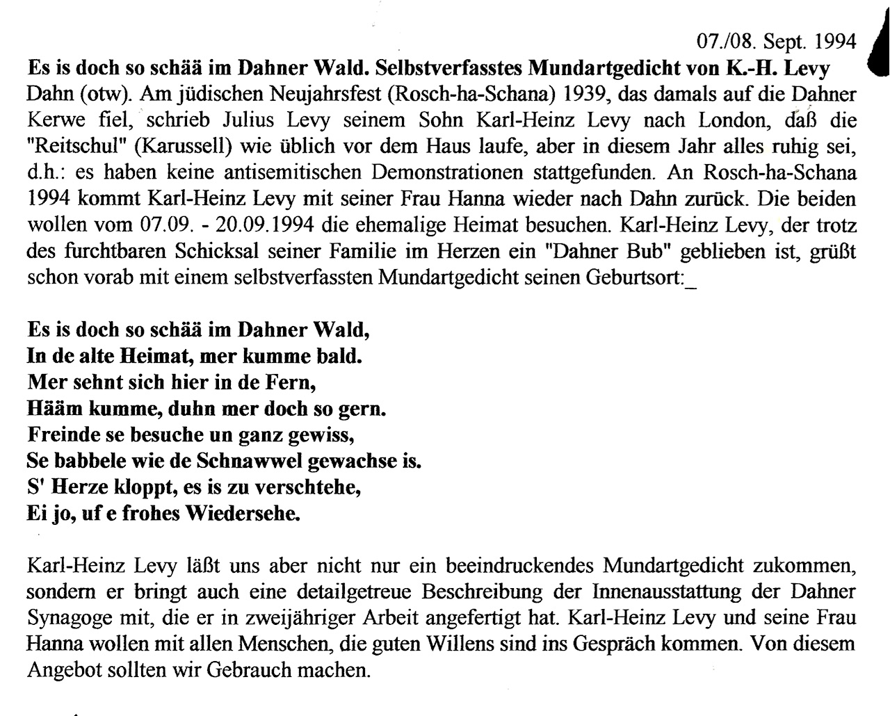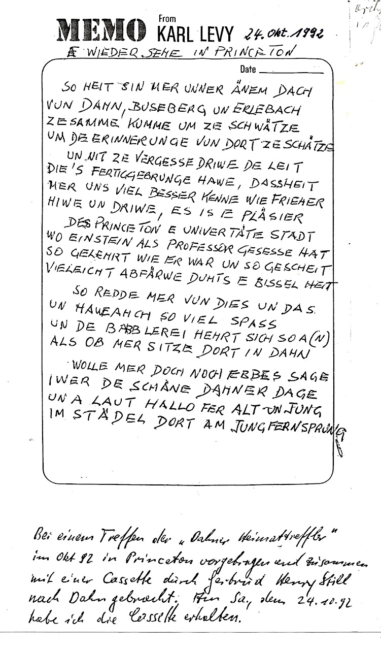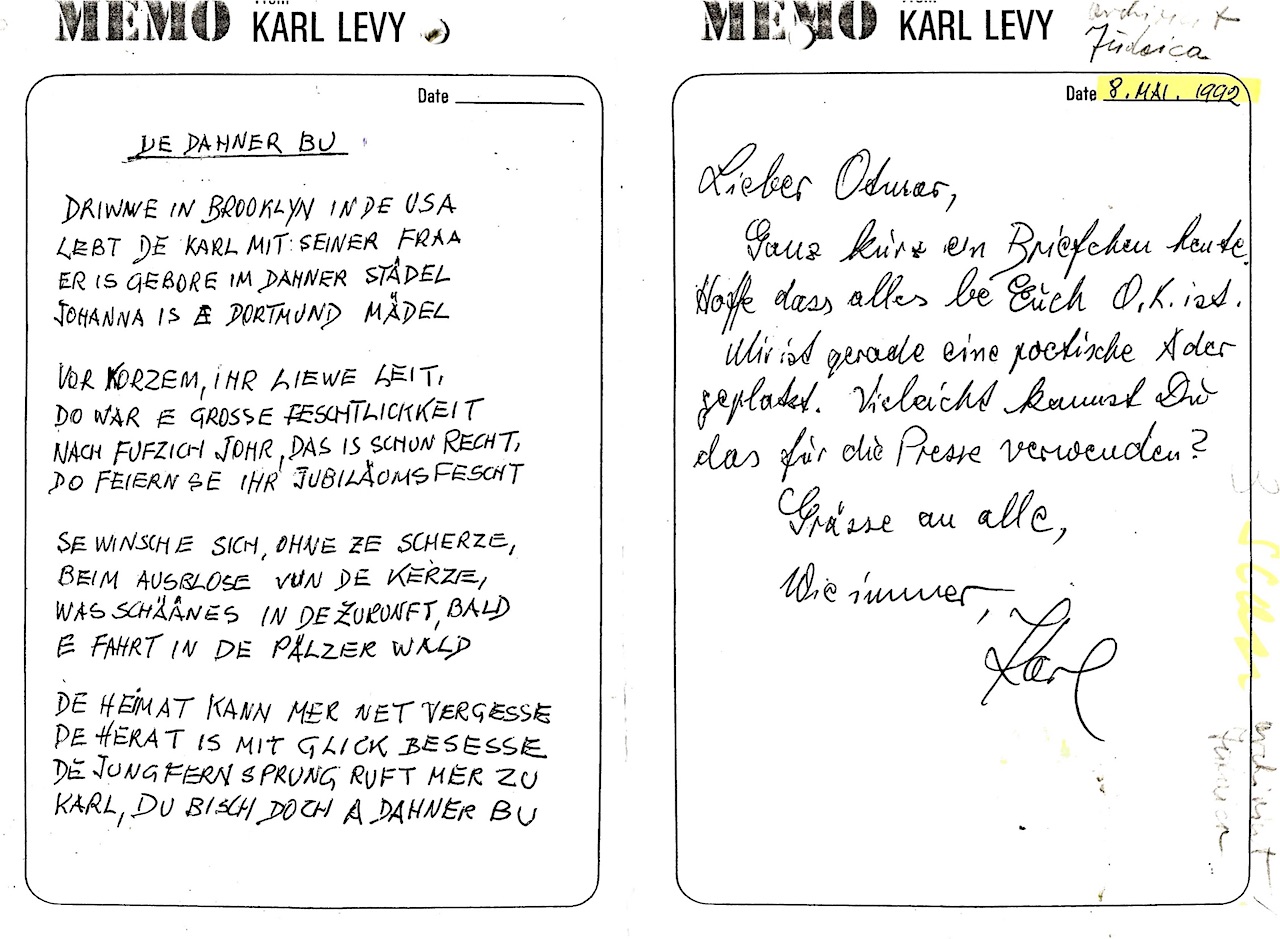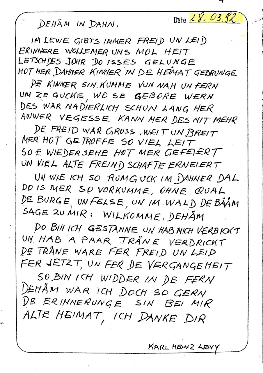 Karl-Heinz Levy. Mundartgedicht: HEIMAT-GEDANKE. Von Karl-Heinz Levy. USA/N.Y. 1994. Trotz allem liebt Karl-Heinz Levy seine Dahner Heimat. Er will Freinde besuche un babbele, wie de Schnawwel gewachse is. Das Gedicht hat er im April 1994 aus Brooklyn/USA per Fax nach Dahn geschickt. Gestiftet: Karl-Heinz Levy, April 1994